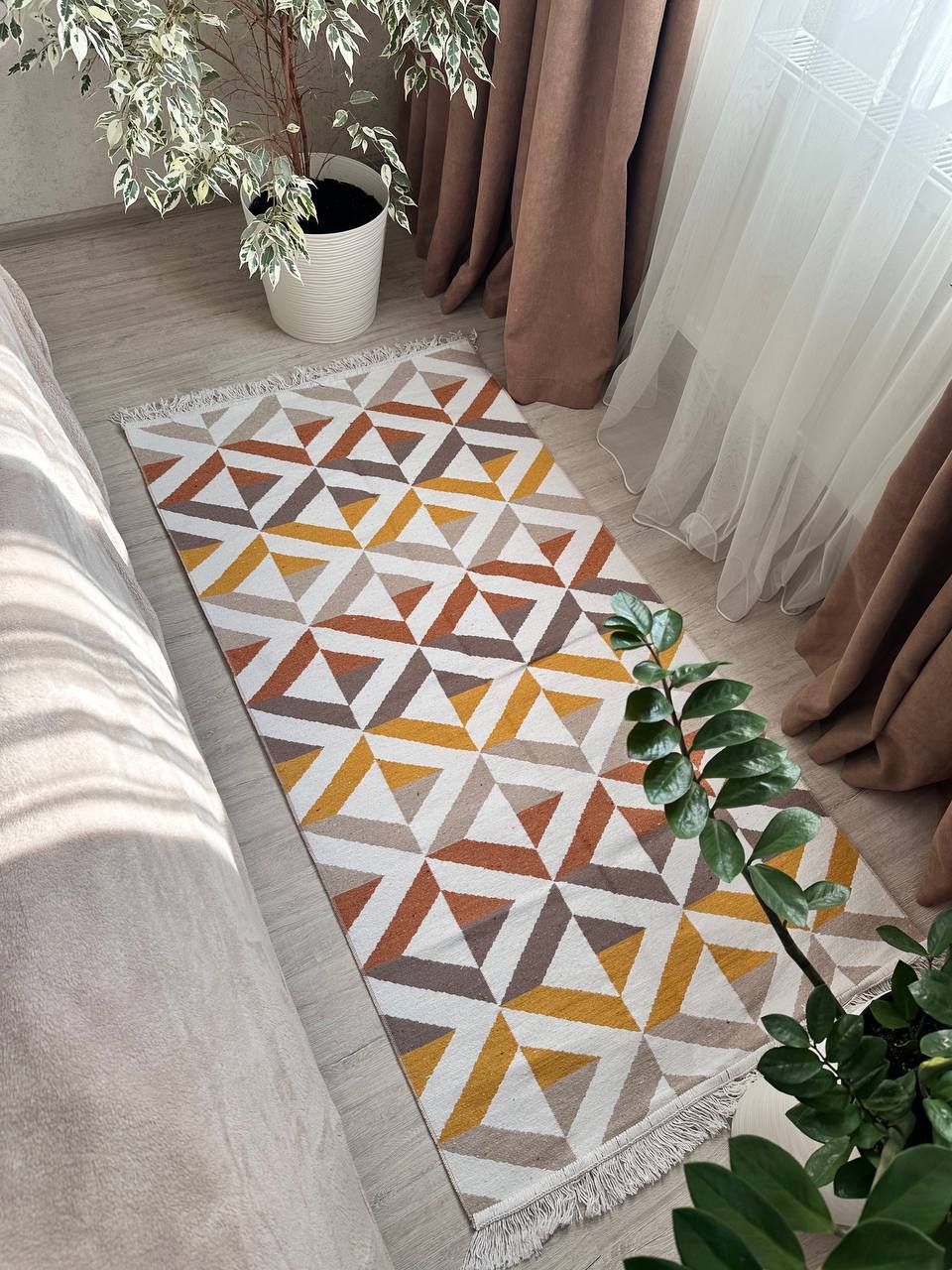 Килим виготовлений на фабриці в Туречинні, кожний узор - це окремий колір нитки. Складається з 100% бавовни, приємний на дотик, можна прати в машинці, чітко виглядає, як на фото.
