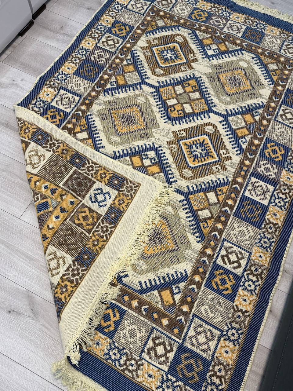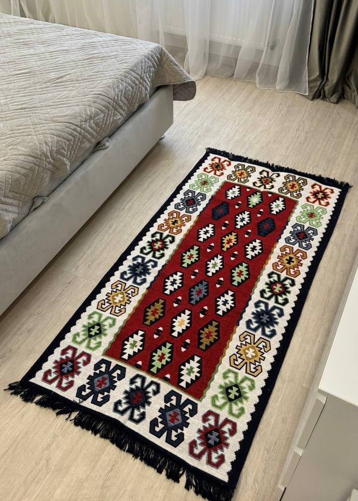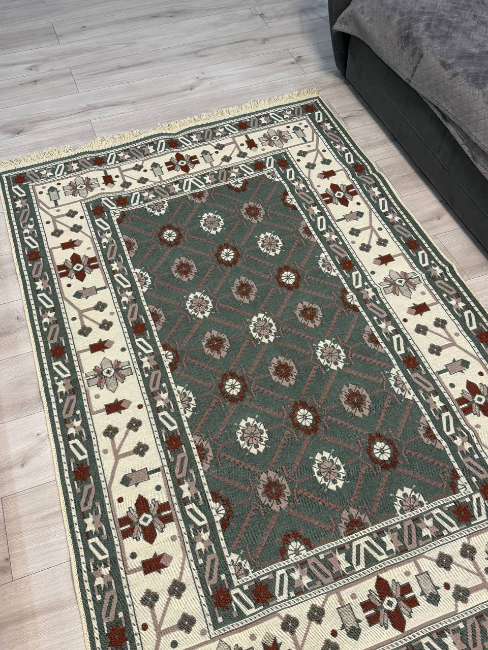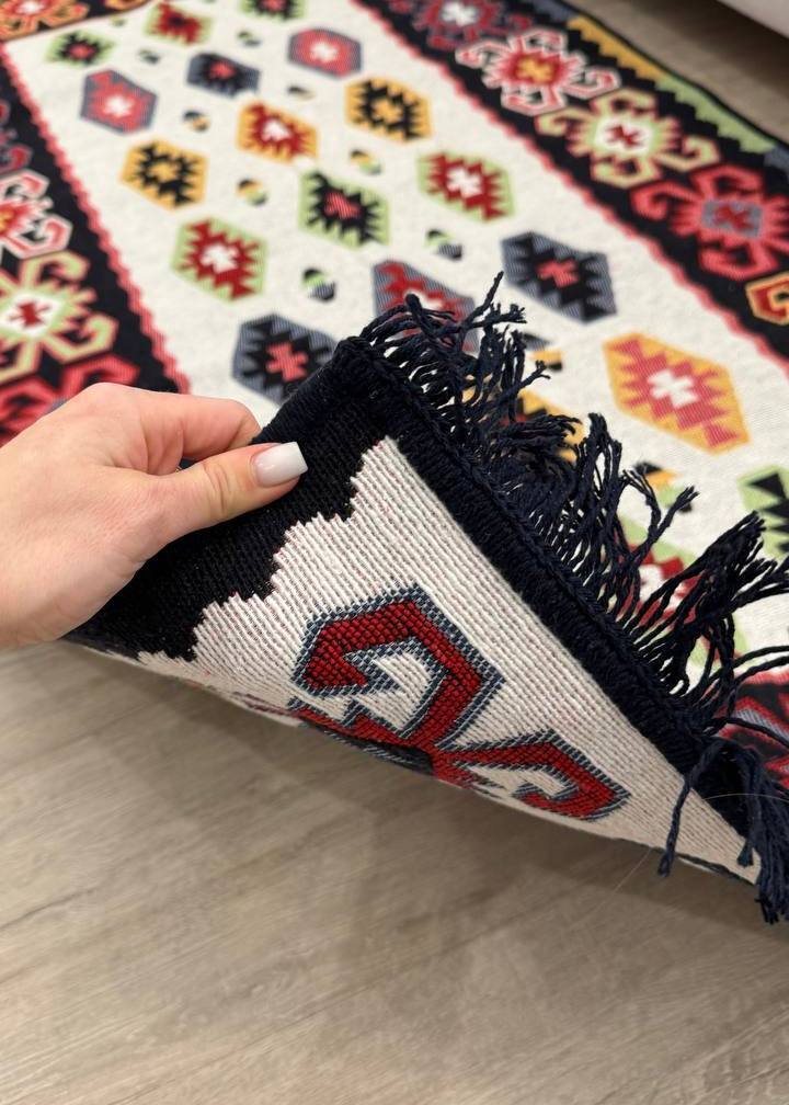 Килим виготовлений з цупкої бавовняної нитки, за рахунок якої не пропускає холод. Має чіткий візерунок, як на фото, дуже гарні узори, які якісно прошиті. Виробництво: Туречинна