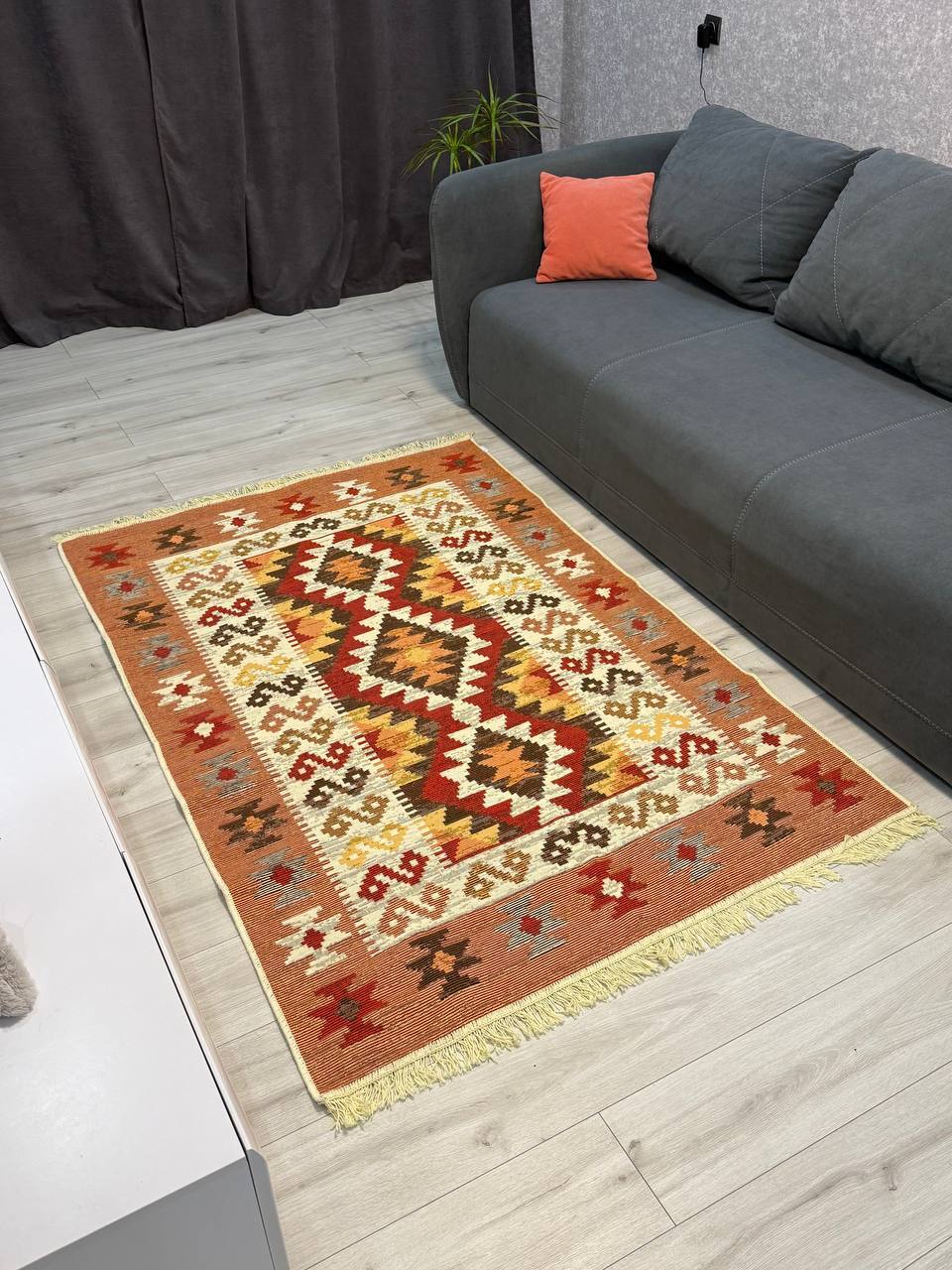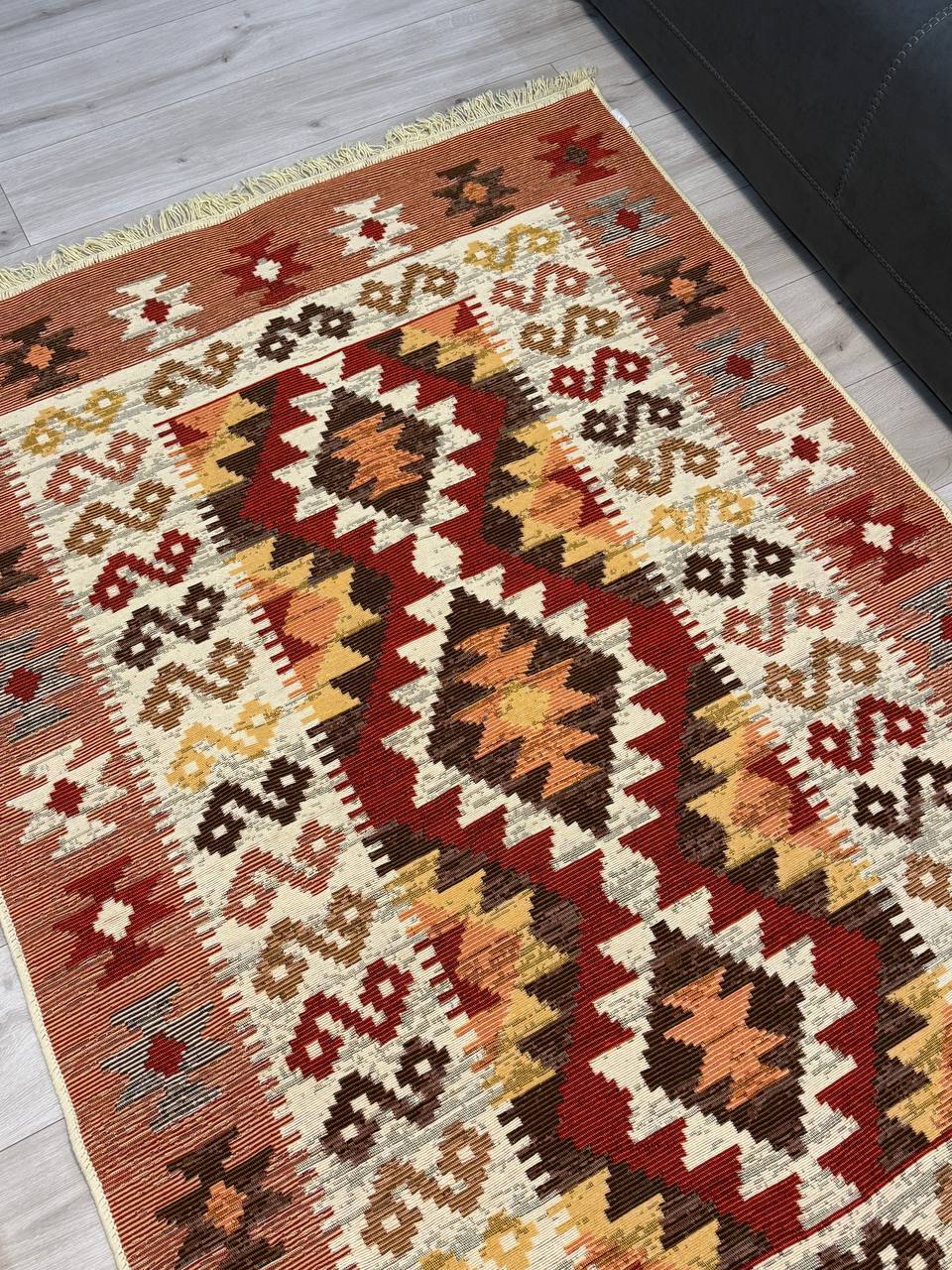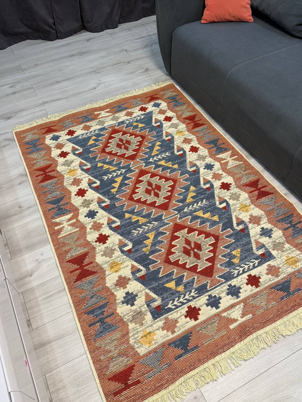 Килим виготовлений з цупкої бавовняної нитки, за рахунок якої не пропускає холод. Має чіткий візерунок, як на фото, дуже гарні узори, які якісно прошиті. Виробництво: Туречинна