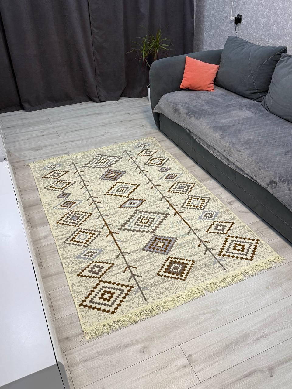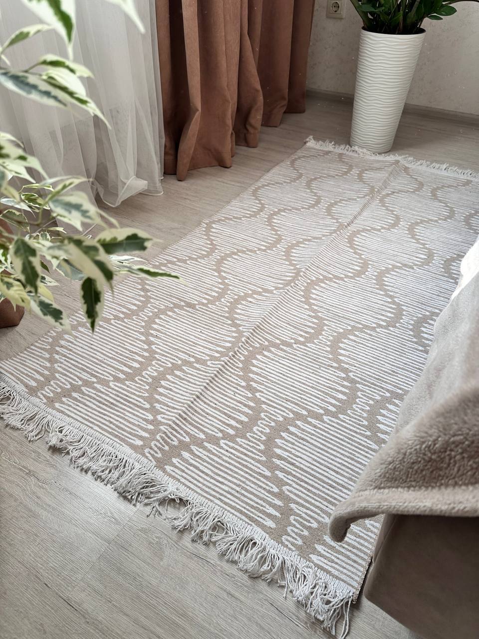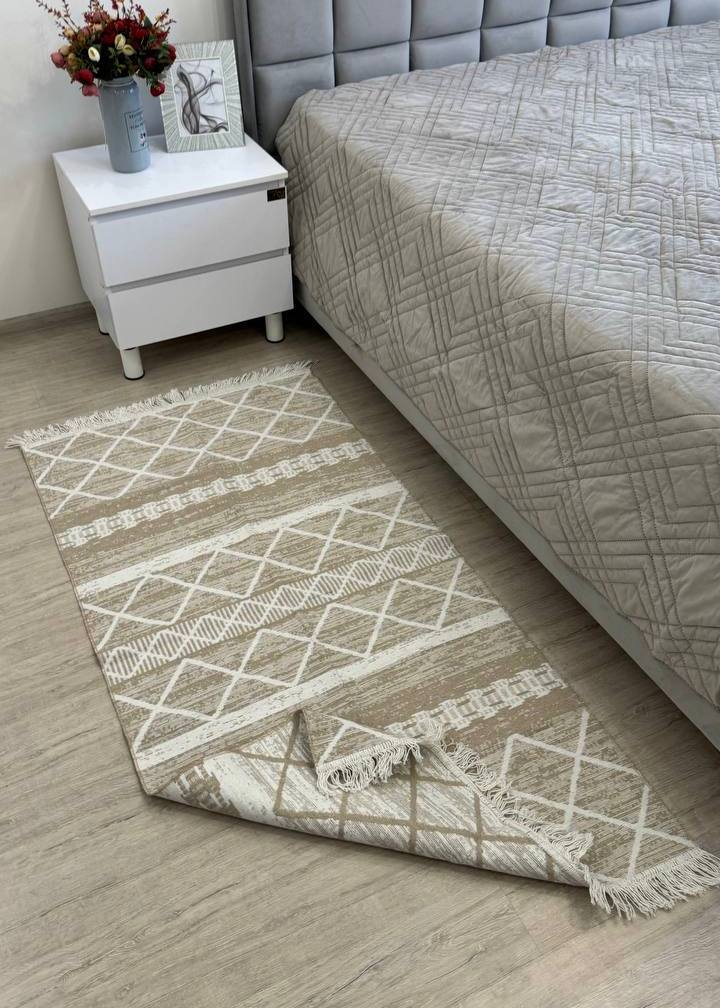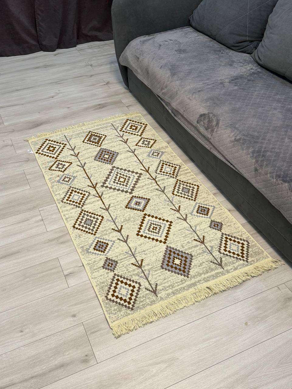 Килим виготовлений з цупкої бавовняної нитки, за рахунок якої не пропускає холод. Має чіткий візерунок, як на фото, дуже гарні узори, які якісно прошиті. Не хвилюйтесь, що килим має світлий колір - його можна без проблем прати в машинці