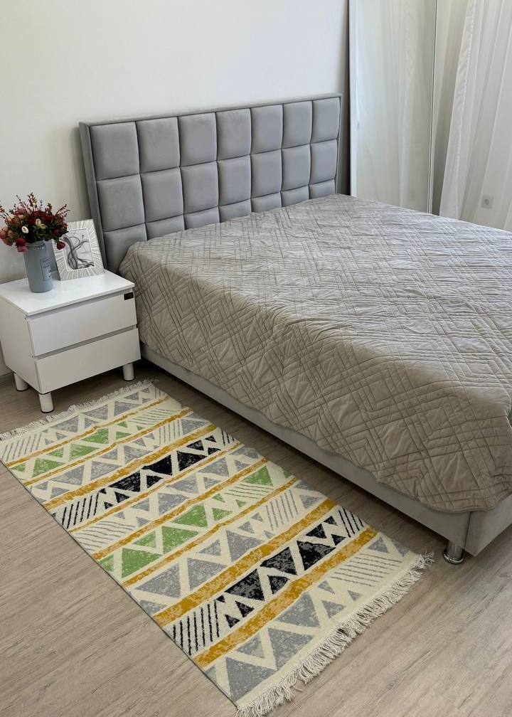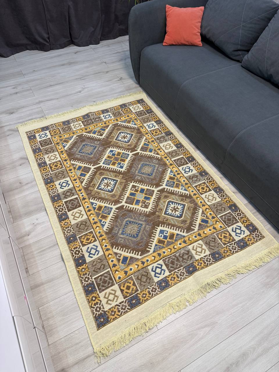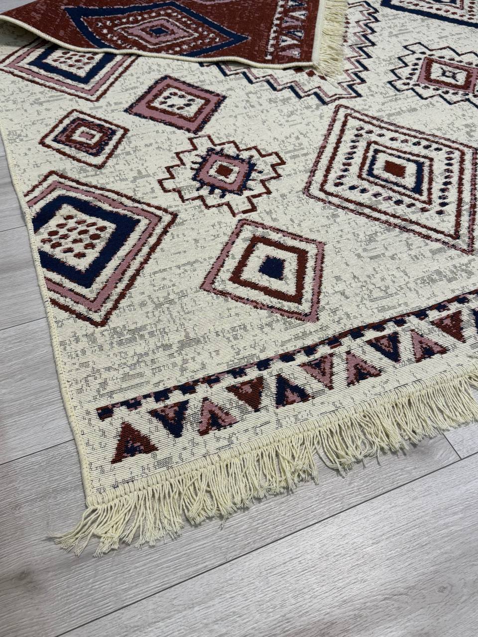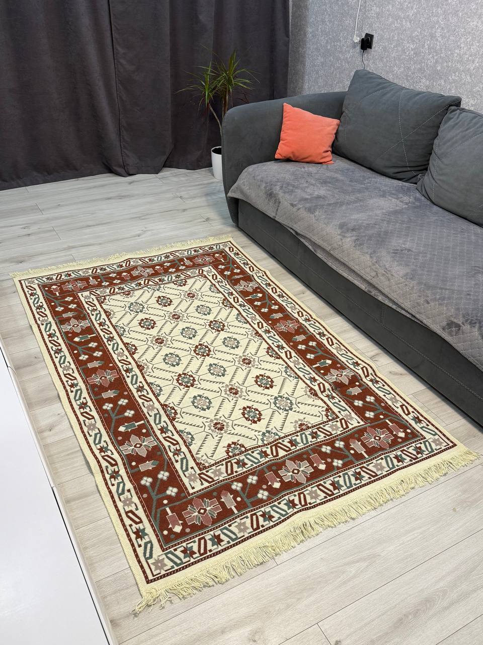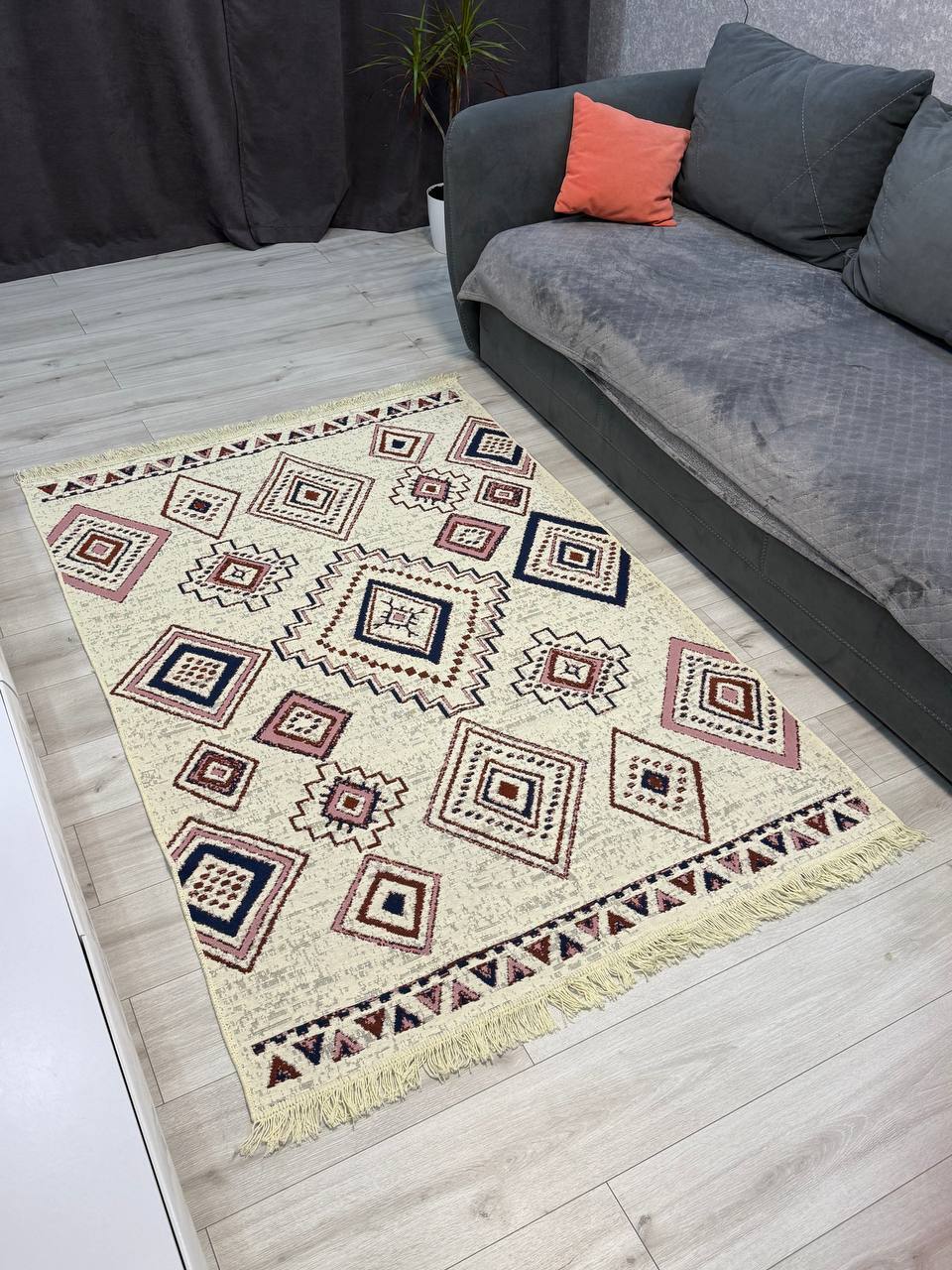 Килим виготовлений з цупкої бавовняної нитки, за рахунок якої не пропускає холод. Має чіткий візерунок, як на фото, дуже гарні узори, які якісно прошиті. Не хвилюйтесь, що килим має світлий колір - його можна без проблем прати в машинці