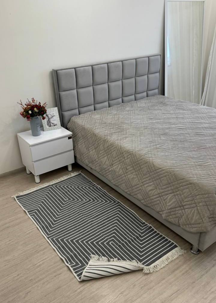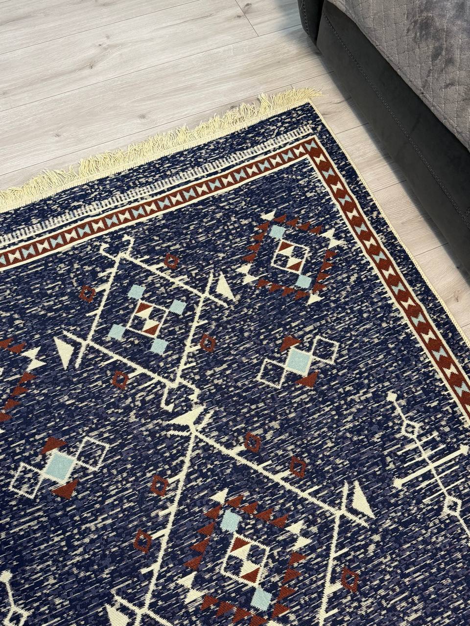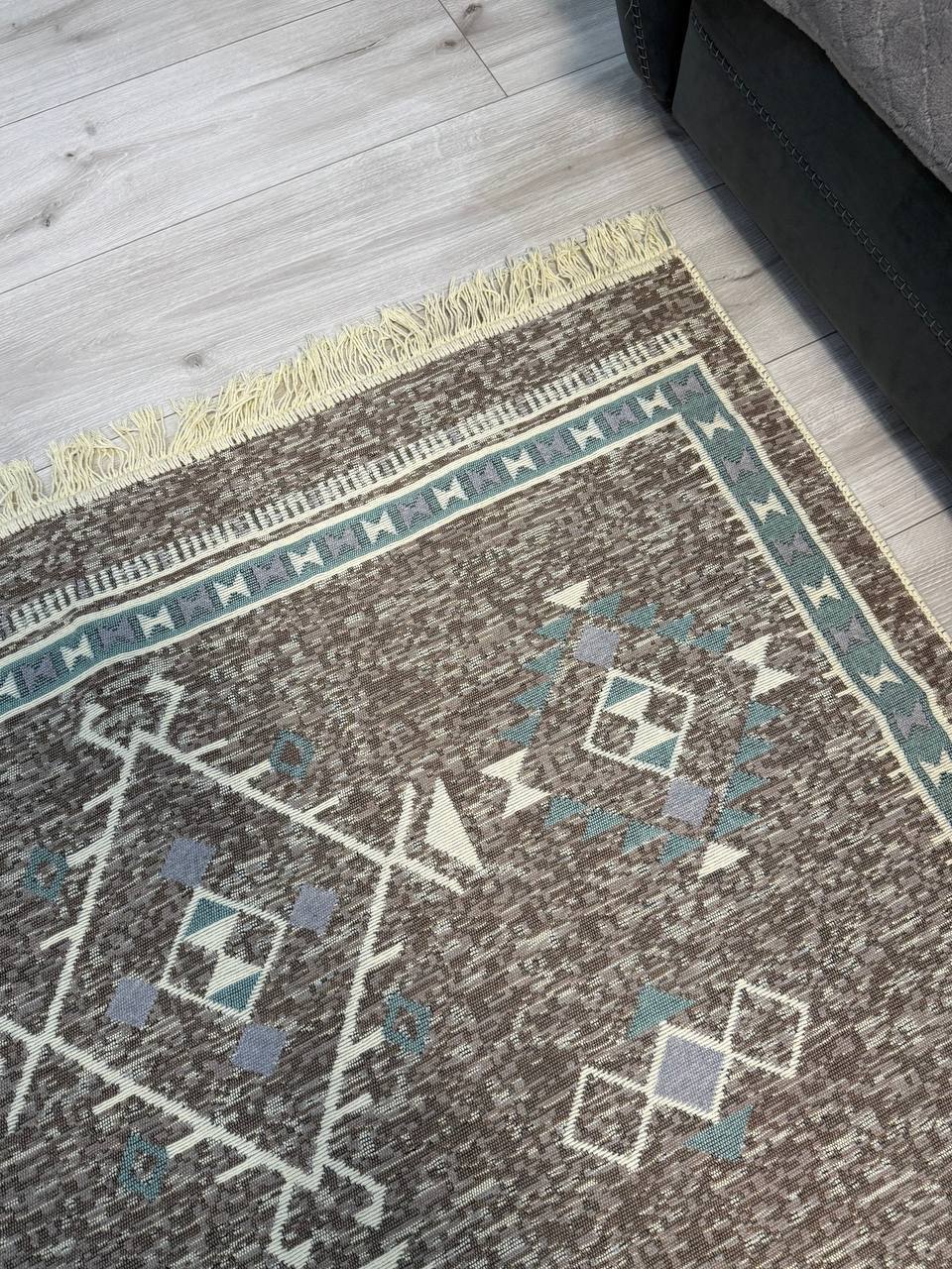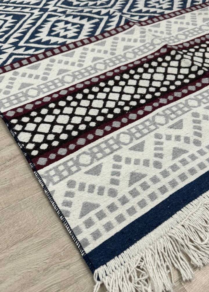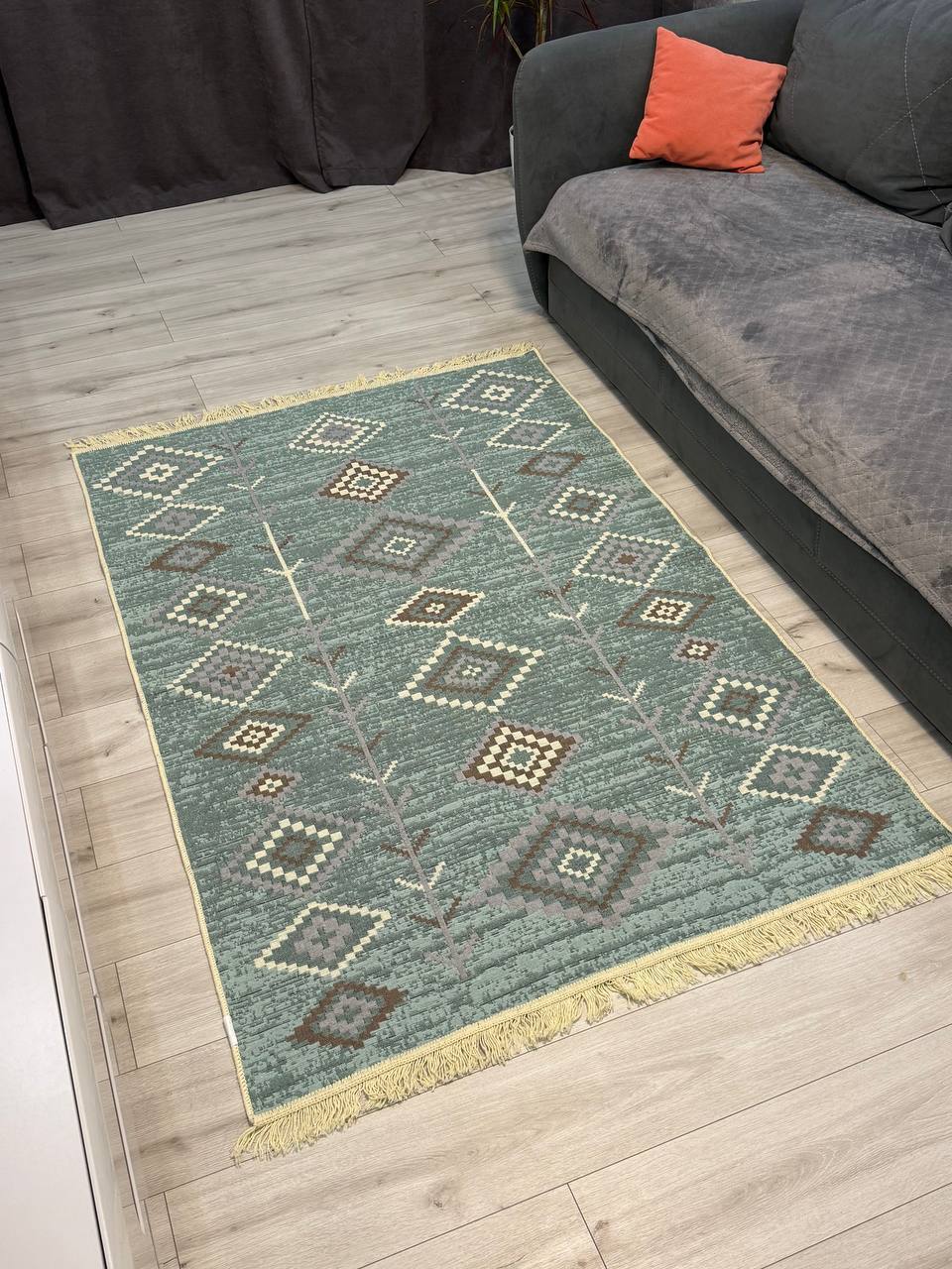 Двосторонній бавовняний килим — стиль і практичність в одному. Це килим у морському відтінку, такий дизайн ще є в сірому та бежевому. Дуже приємний та м'який на дотик, можна легко прати в машинці