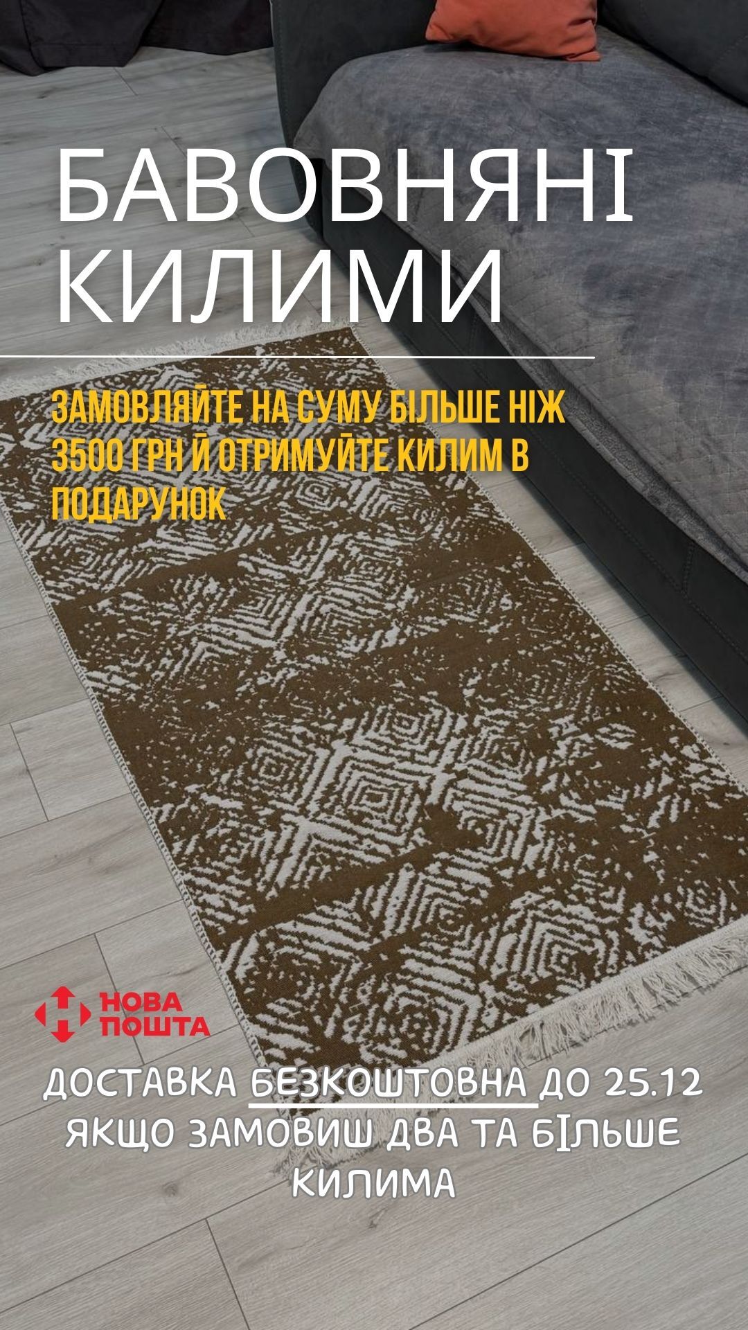 Килим виготовлений з цупкої бавовняної нитки, за рахунок якої не пропускає холод. Має чіткий візерунок, як на фото, дуже гарні узори, які якісно прошиті. Виробництво: Туречинна