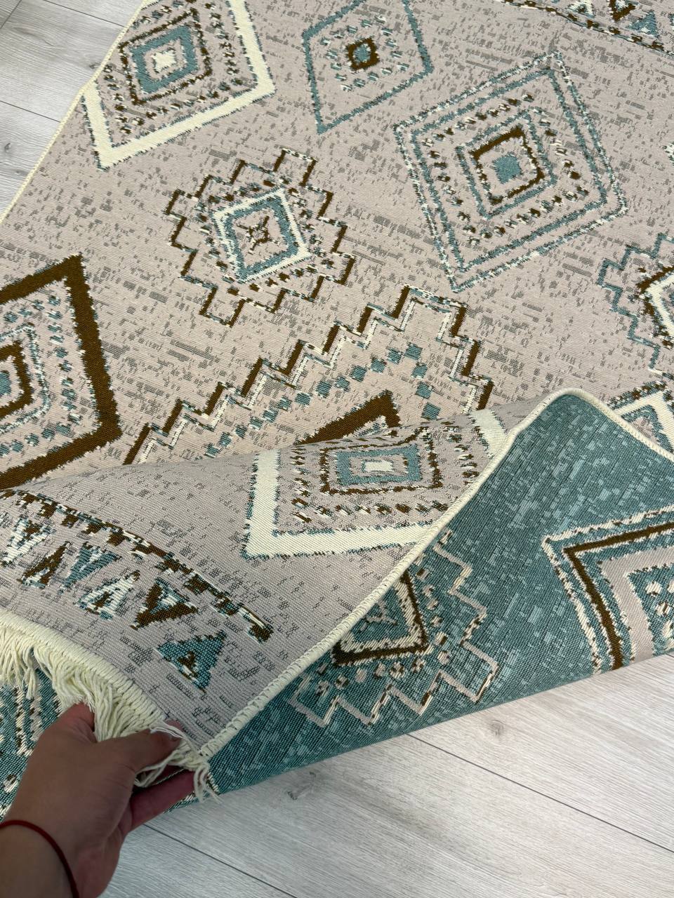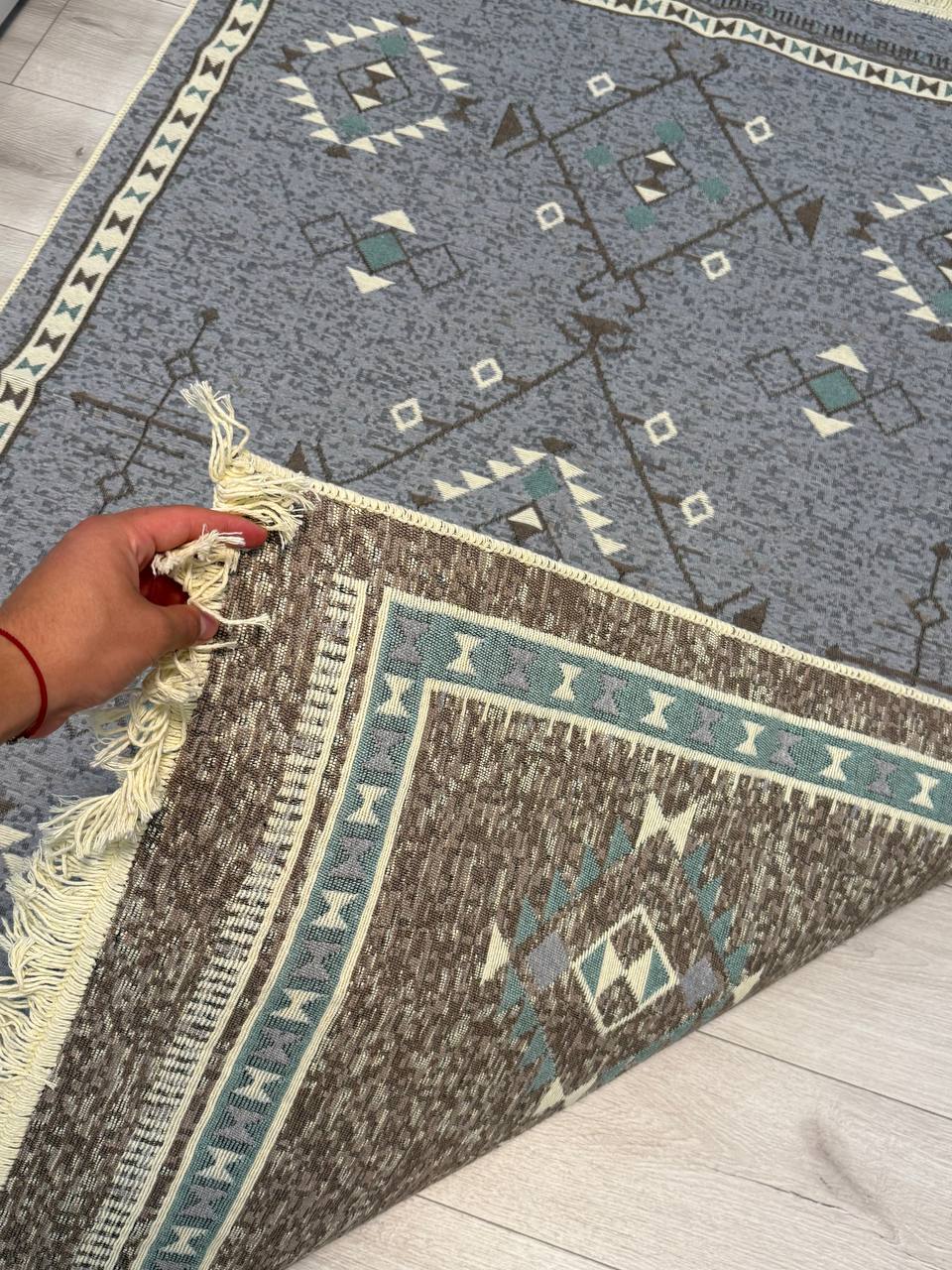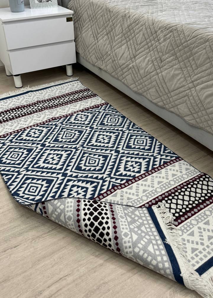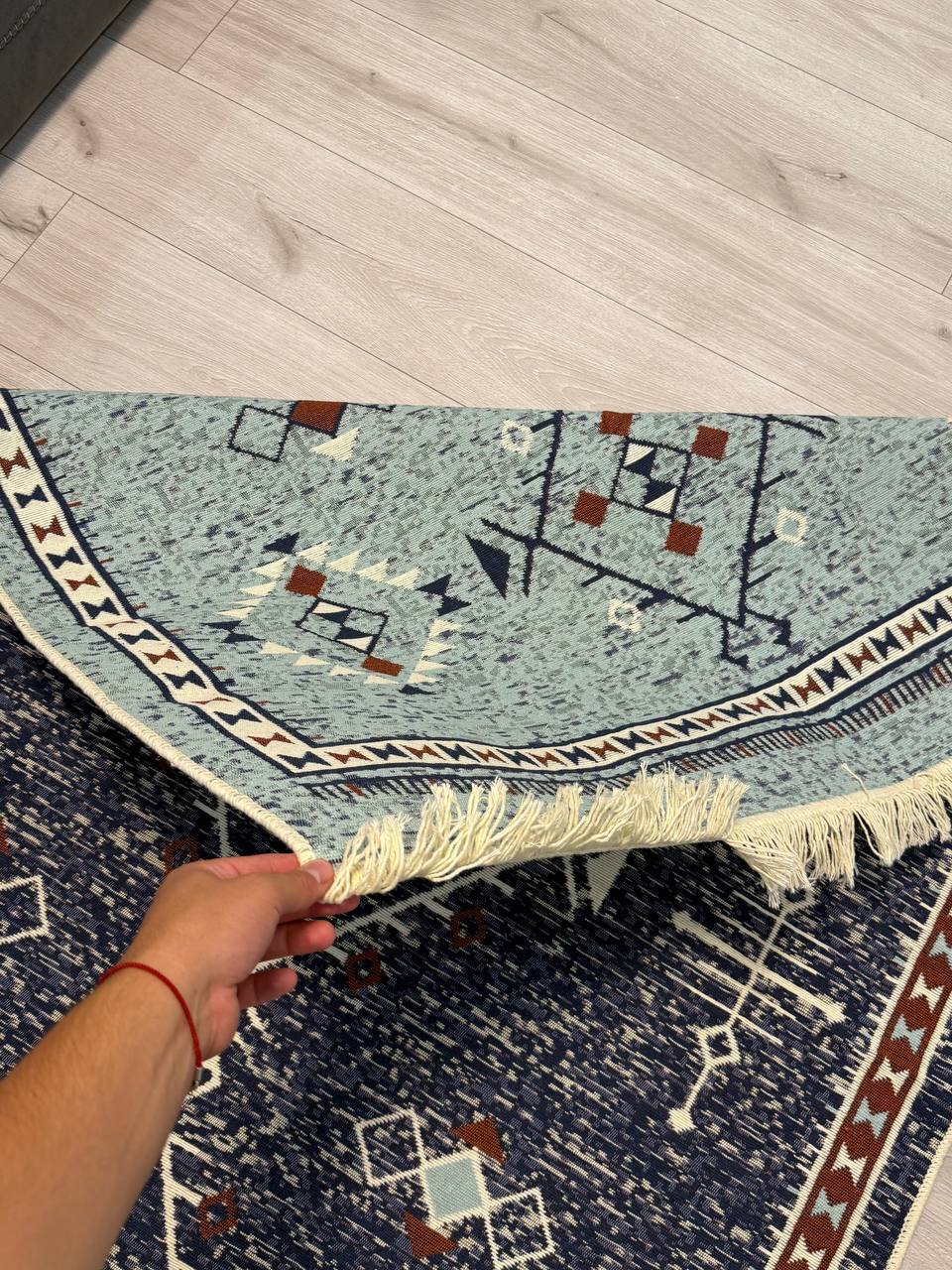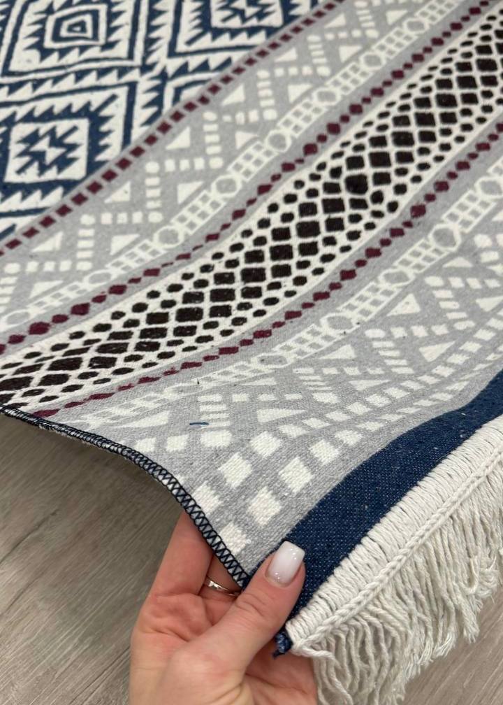 Двосторонній бавовняний килим — стиль і практичність в одному. Це килим у морському відтінку, такий дизайн ще є в сірому та бежевому. Дуже приємний та м'який на дотик, можна легко прати в машинці