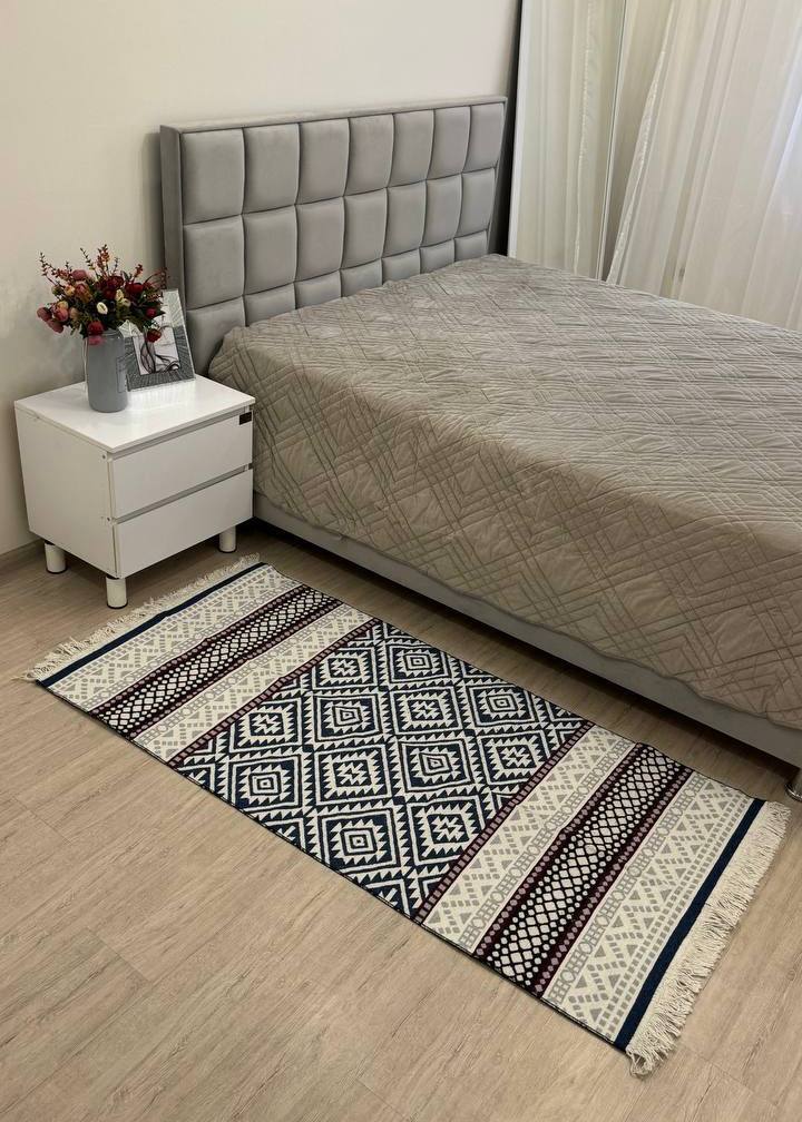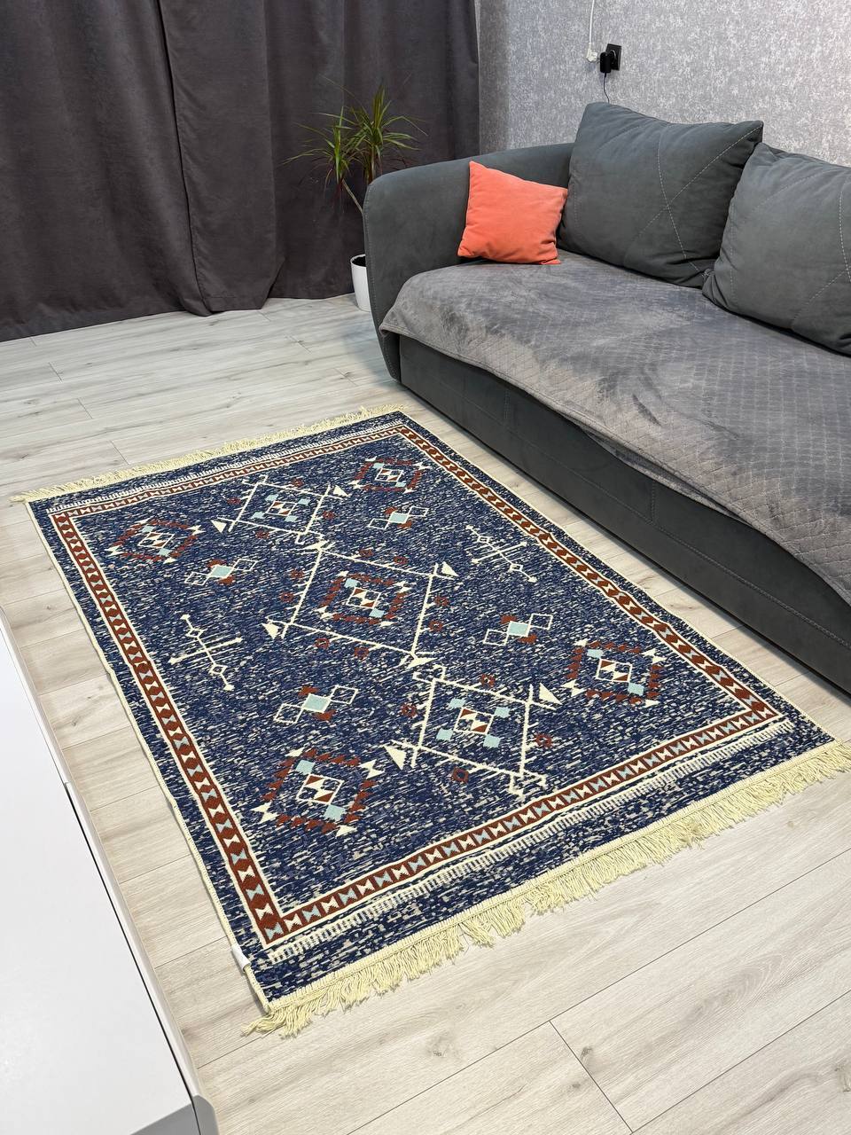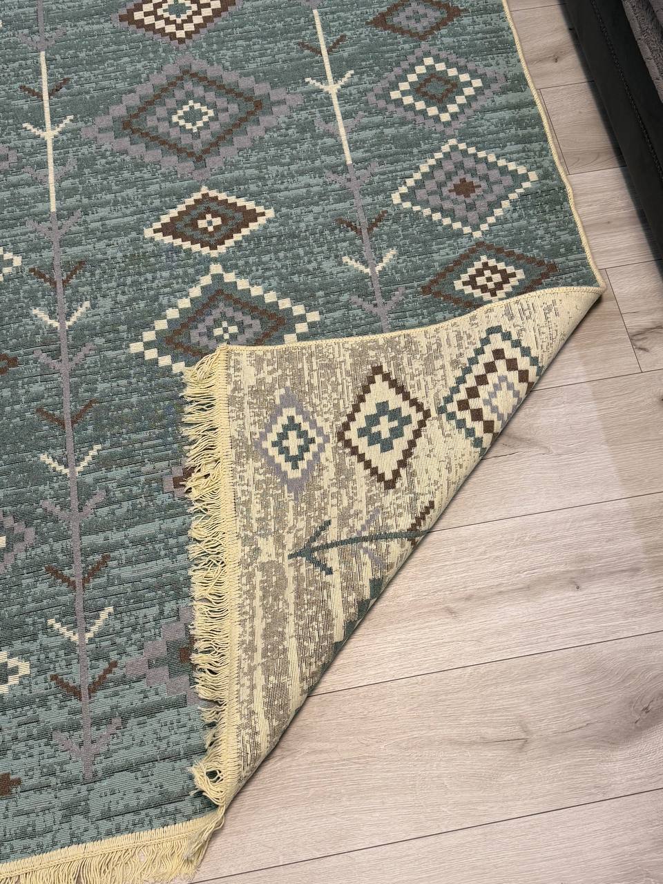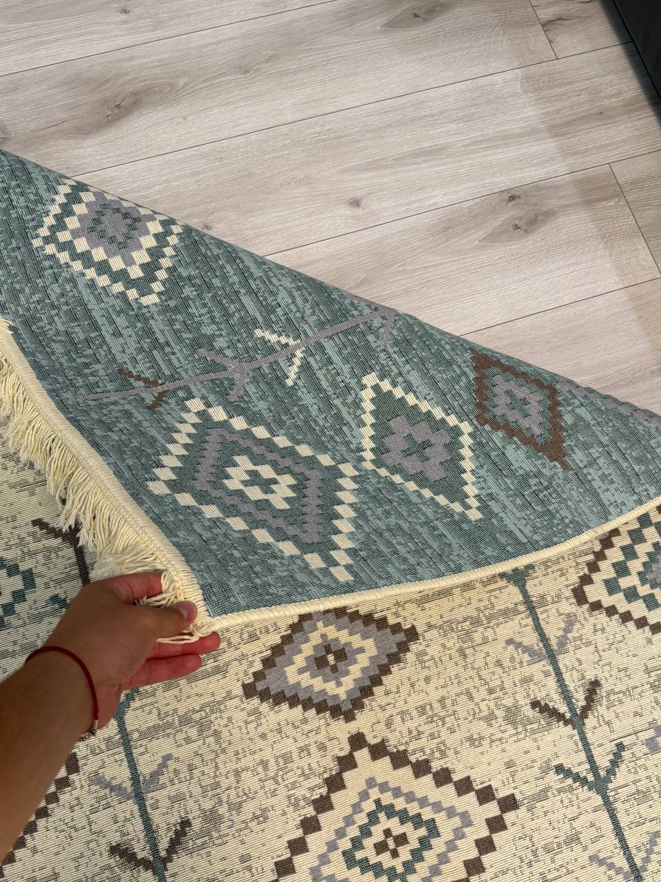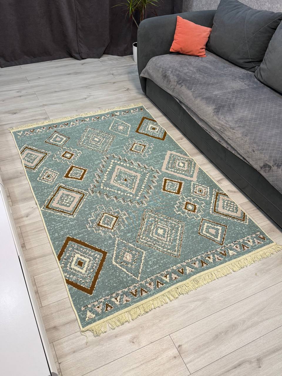 Двосторонній бавовняний килим — стиль і практичність в одному. Це килим у морському відтінку, такий дизайн ще є в сірому та бежевому. Дуже приємний та м'який на дотик, можна легко прати в машинці