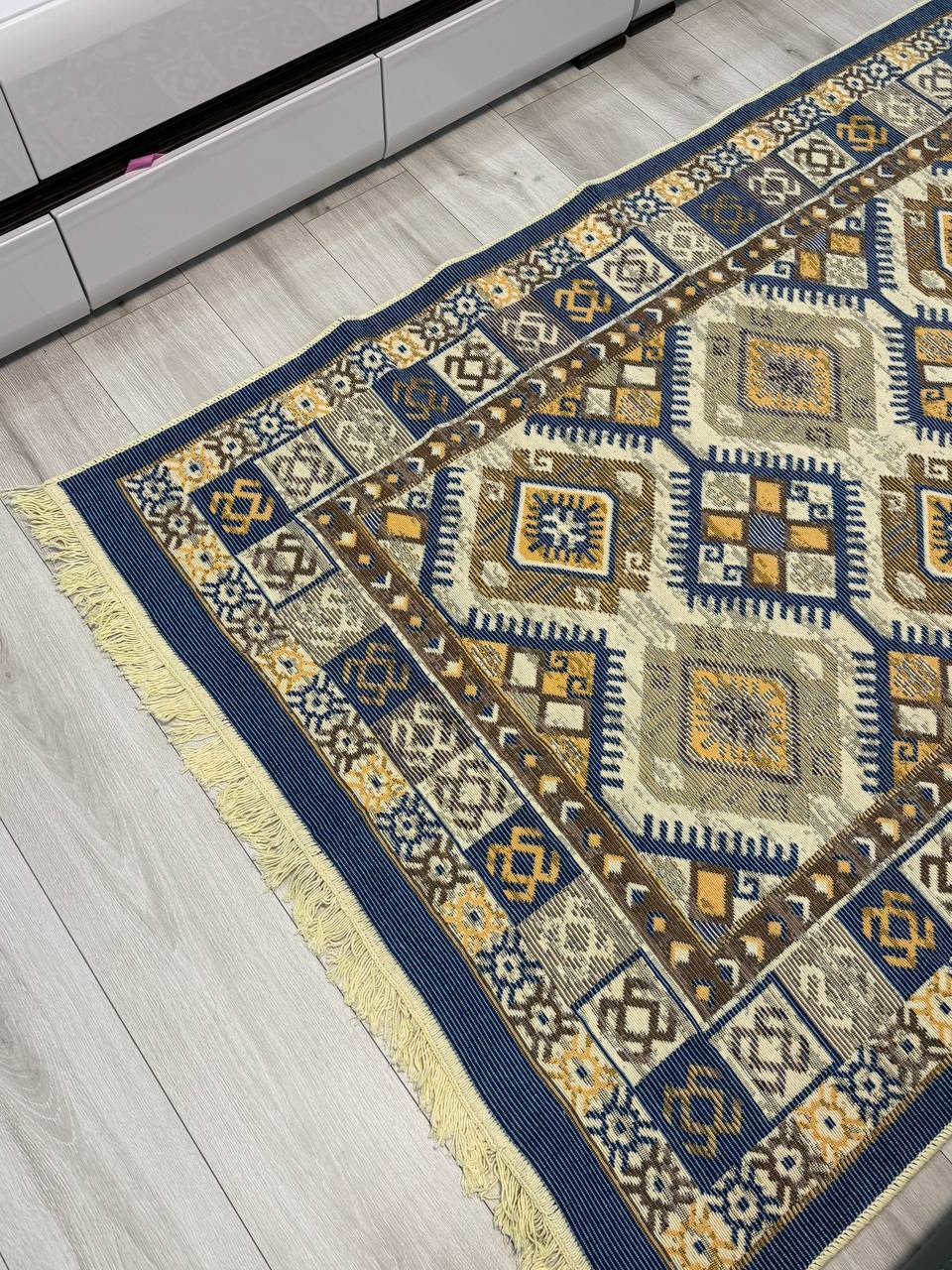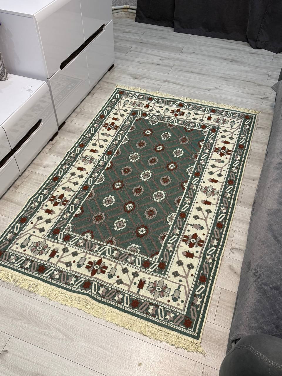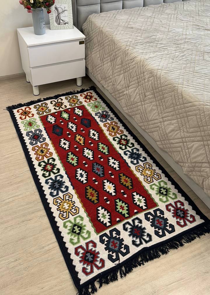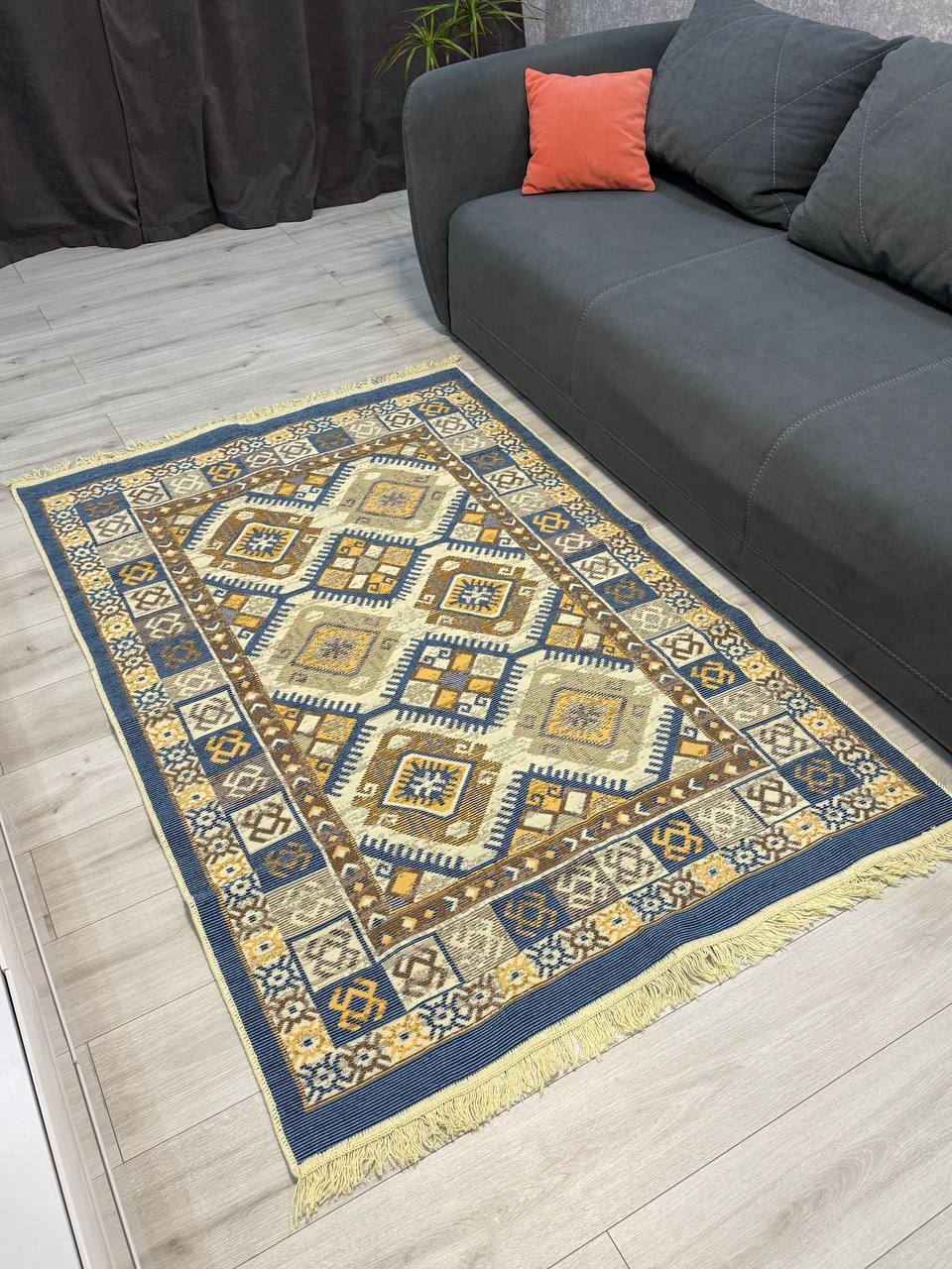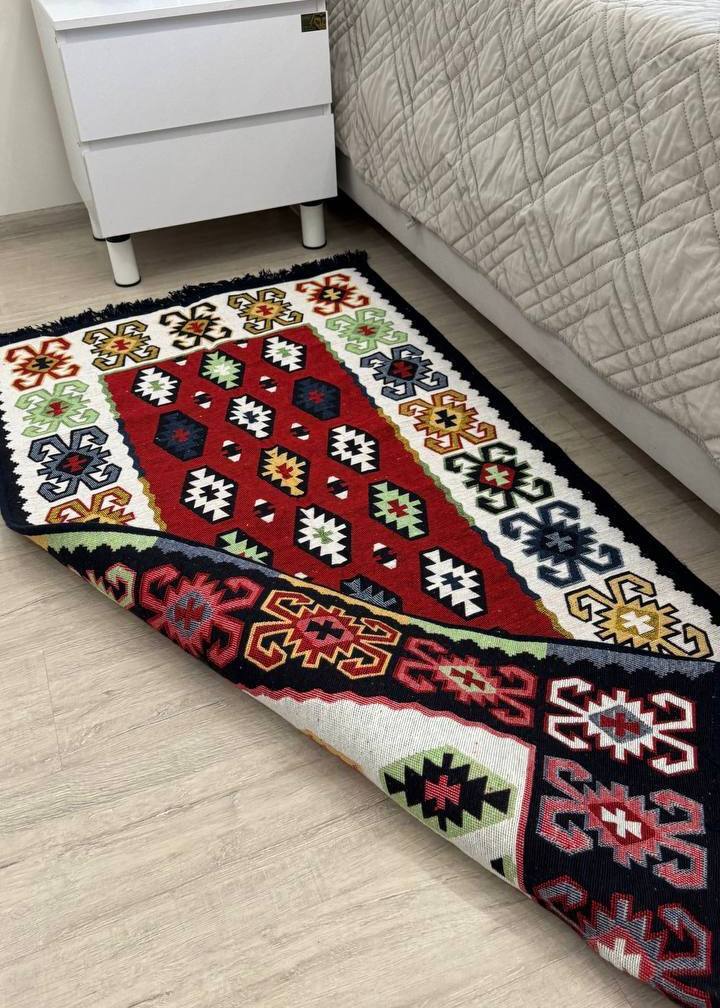 Килим виготовлений з цупкої бавовняної нитки, за рахунок якої не пропускає холод. Має чіткий візерунок, як на фото, дуже гарні узори, які якісно прошиті. Виробництво: Туречинна