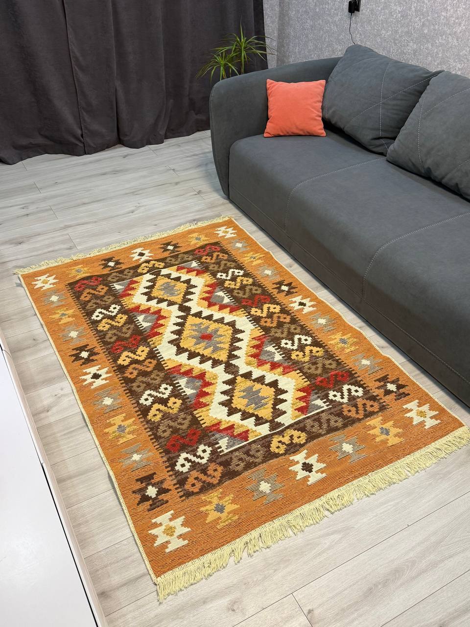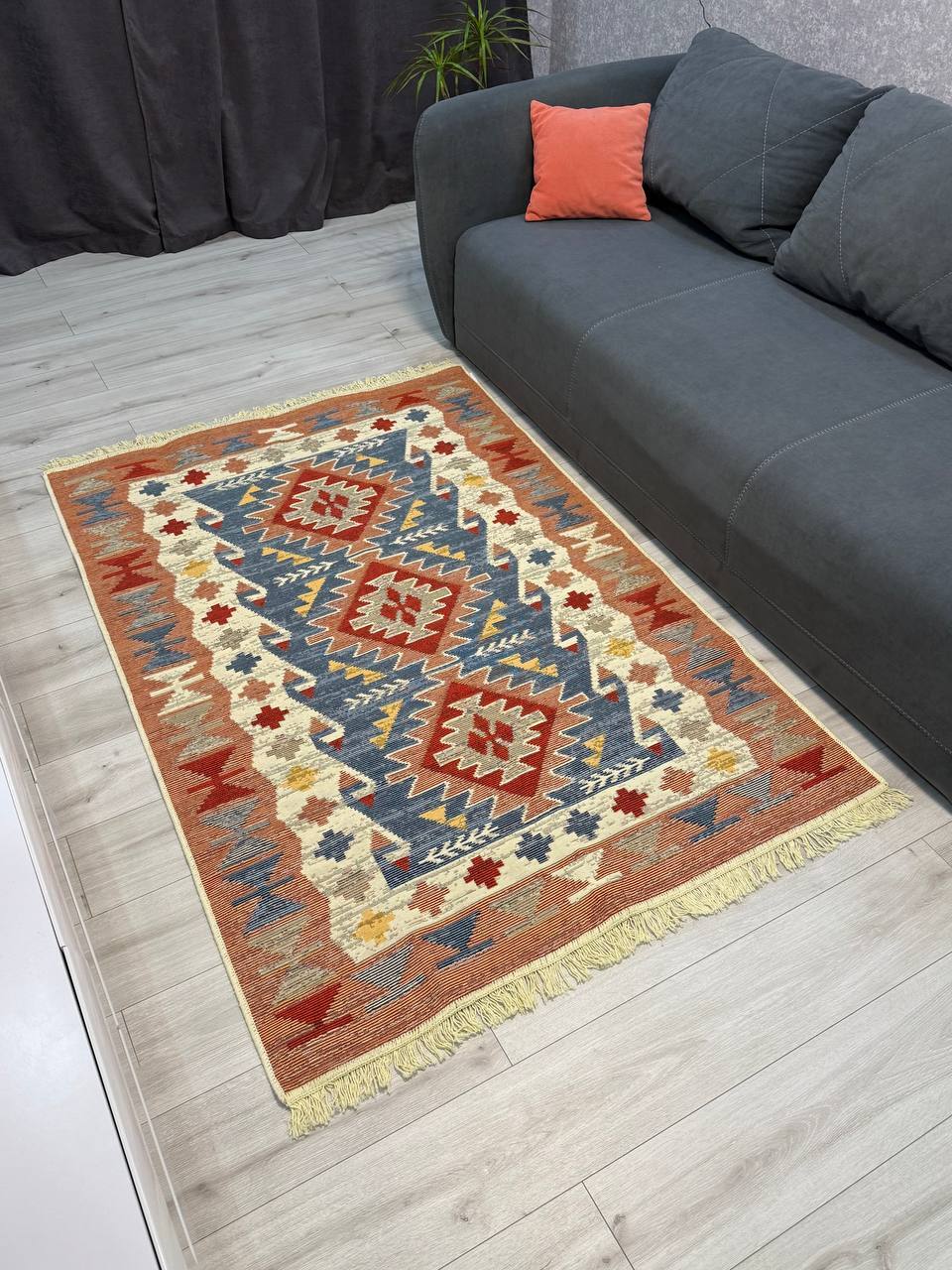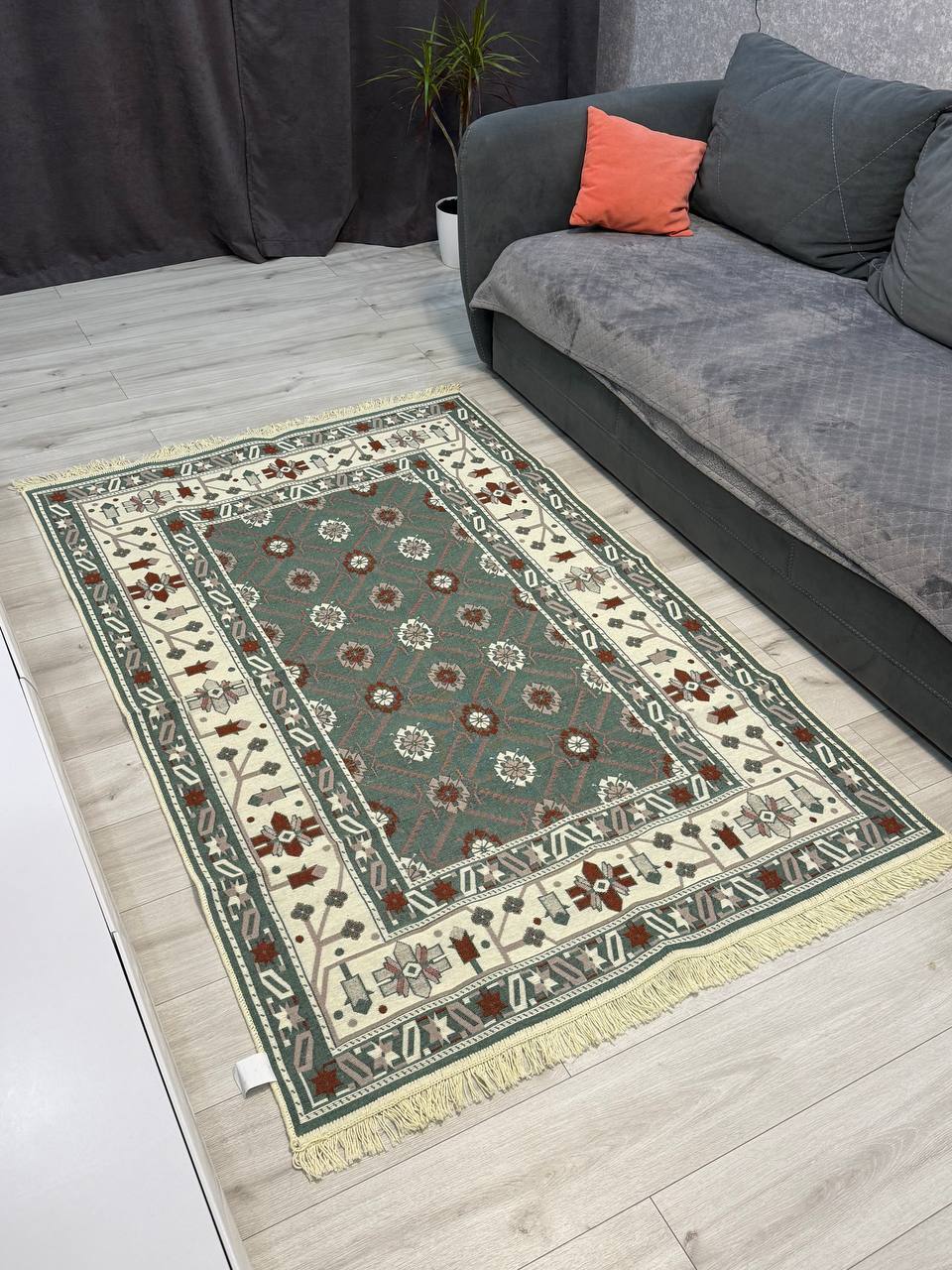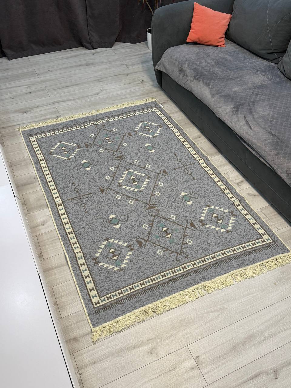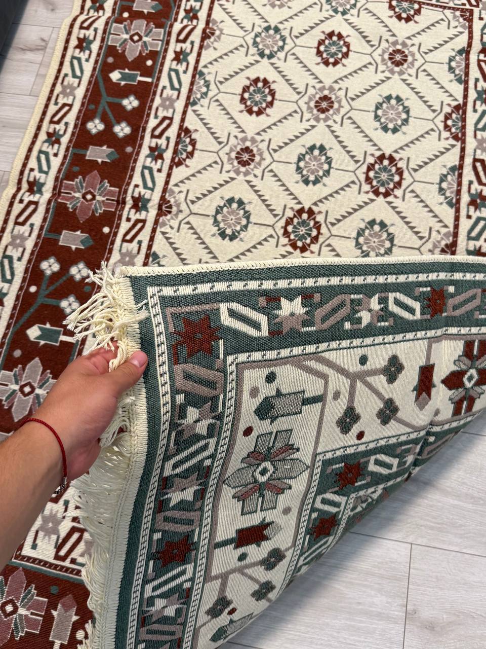 Килим виготовлений з цупкої бавовняної нитки, за рахунок якої не пропускає холод. Має чіткий візерунок, як на фото, дуже гарні узори, які якісно прошиті. Виробництво: Туречинна