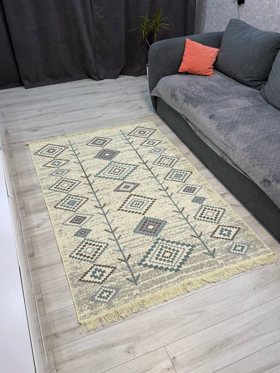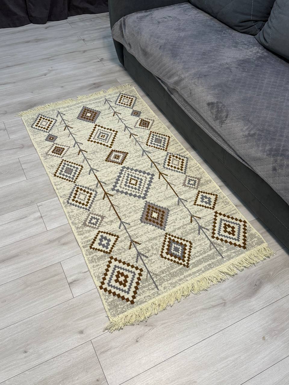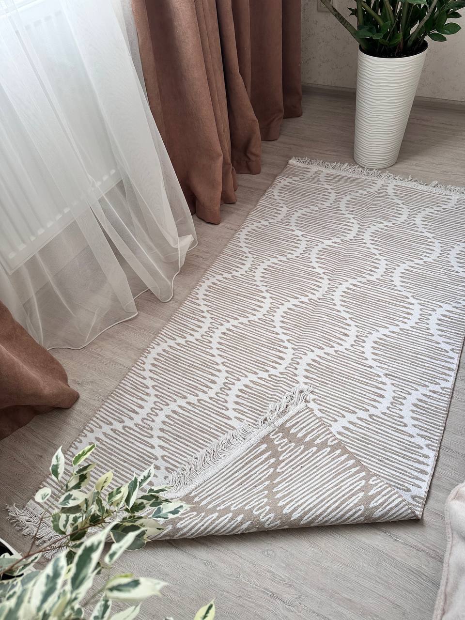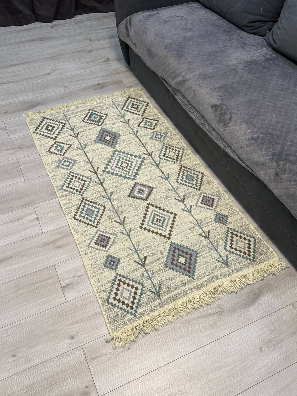 Килим виготовлений з цупкої бавовняної нитки, за рахунок якої не пропускає холод. Має чіткий візерунок, як на фото, дуже гарні узори, які якісно прошиті. Не хвилюйтесь, що килим має світлий колір - його можна без проблем прати в машинці