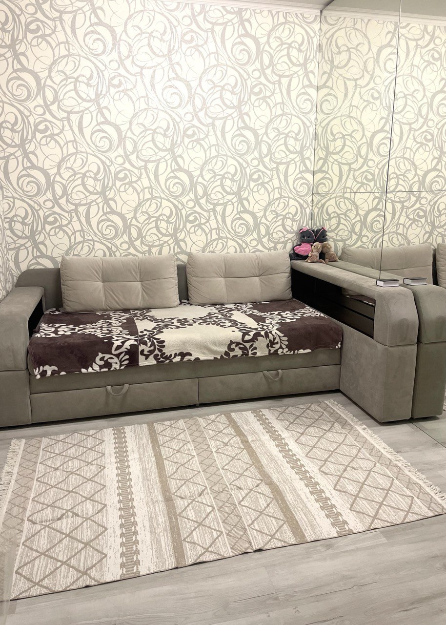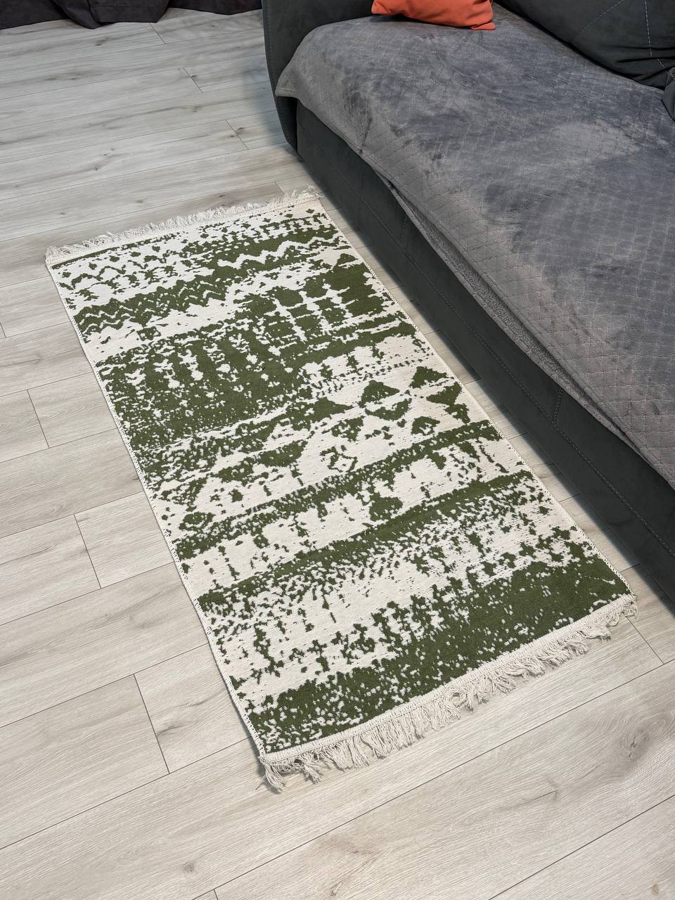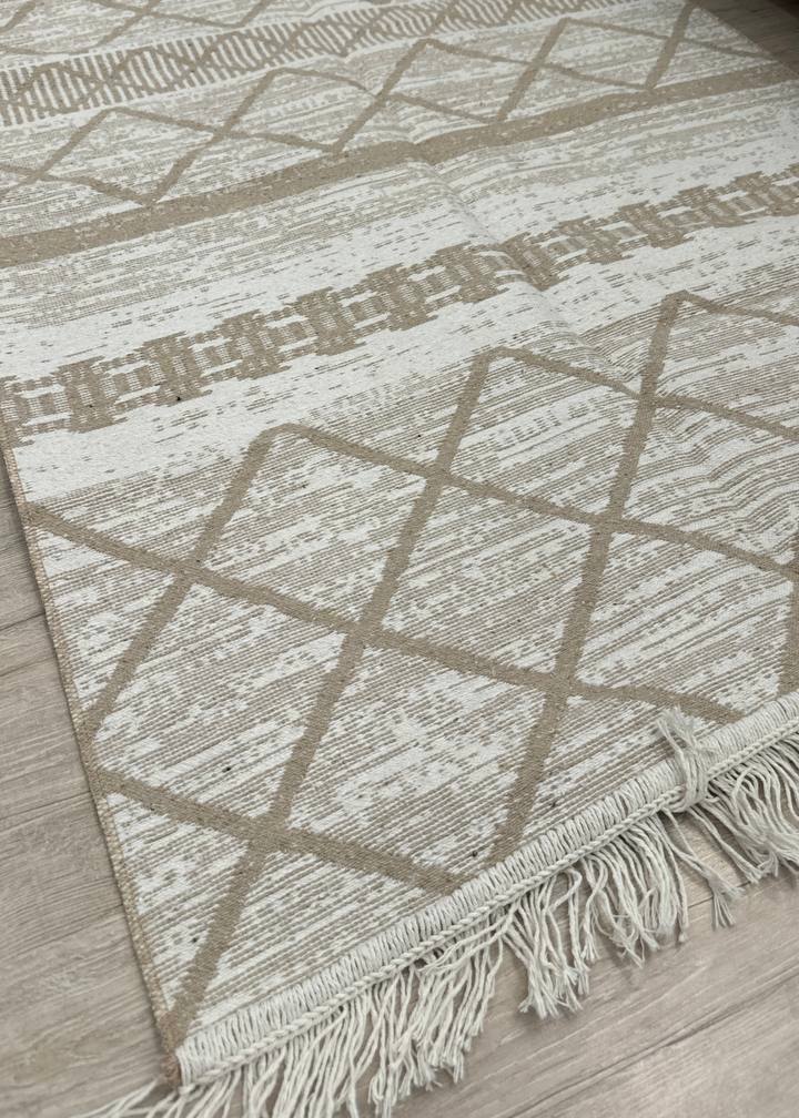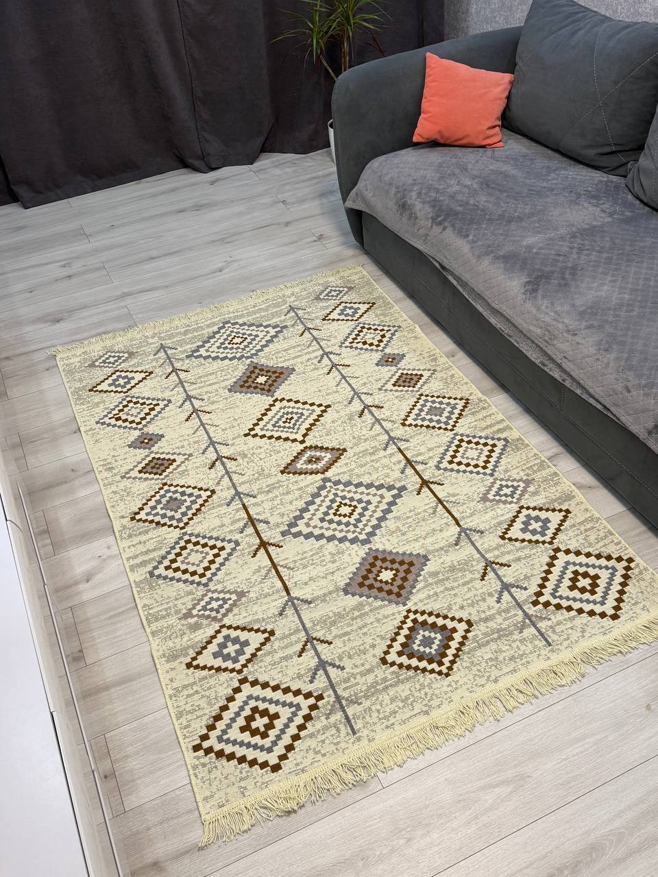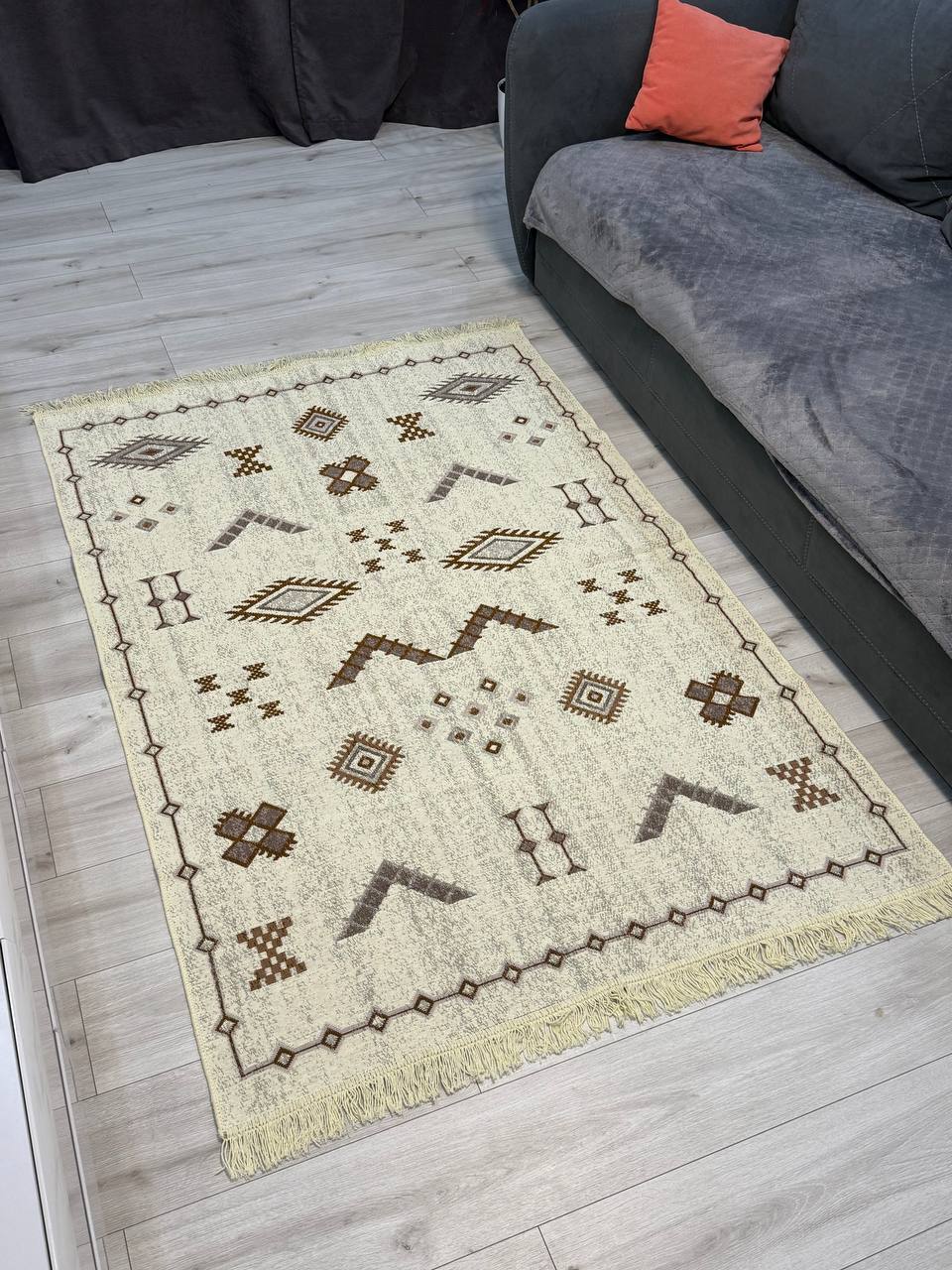 Килим виготовлений з цупкої бавовняної нитки, за рахунок якої не пропускає холод. Має чіткий візерунок, як на фото, дуже гарні узори, які якісно прошиті. Не хвилюйтесь, що килим має світлий колір - його можна без проблем прати в машинці